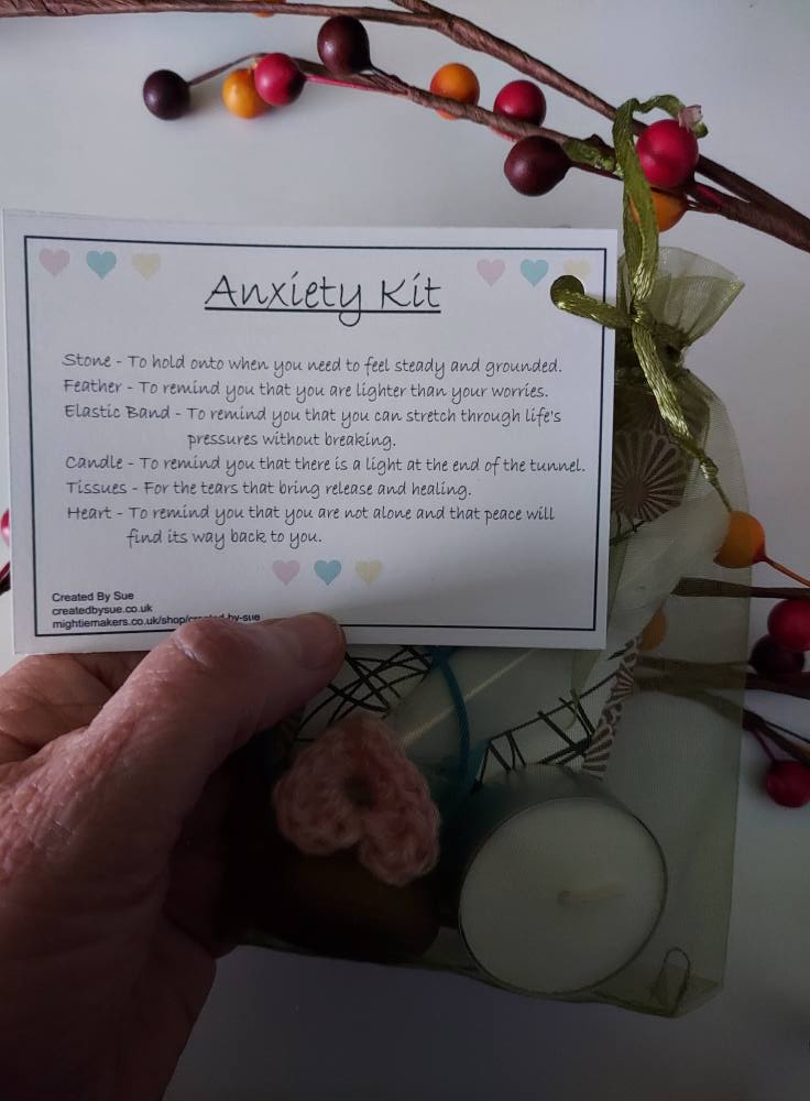 Anxiety Kit: Stone, Feather, Elastic Band, Candle, Tissue, Heart